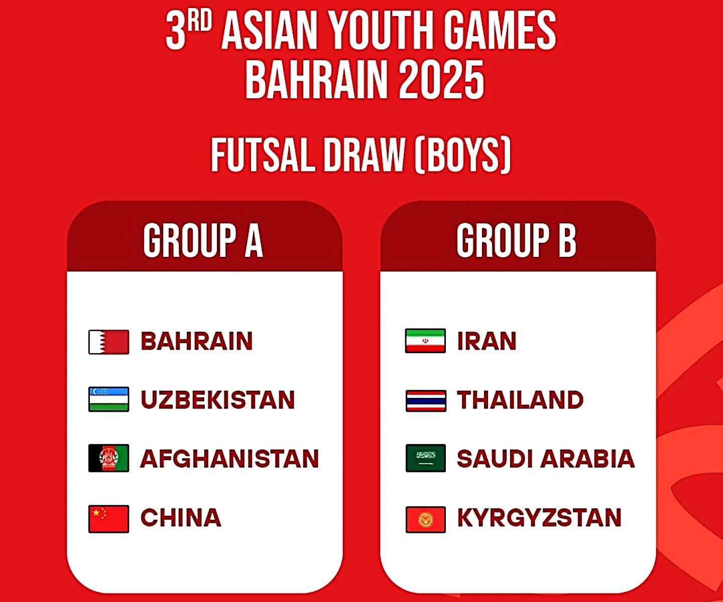 شورای المپیک آسیا اعلام کرد که قرعهکشی مرحله گروهی مسابقات فوتسال زیر ١٧سال بازیهای آسیایی بحرین انجام شده و تیم فوتسال زیر ١٧سال افغانستان در گروه اول این رقابتها با تیمهای بحرین، اوزبیکستان و چین همگروه شده است. این بازیها از تاریخ ۳۰میزان تا نهم عقرب ۱۴۰۴برگزار خواهد شد.