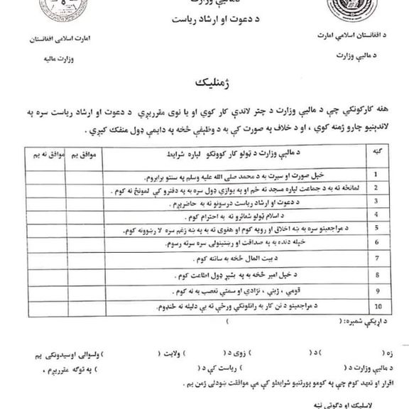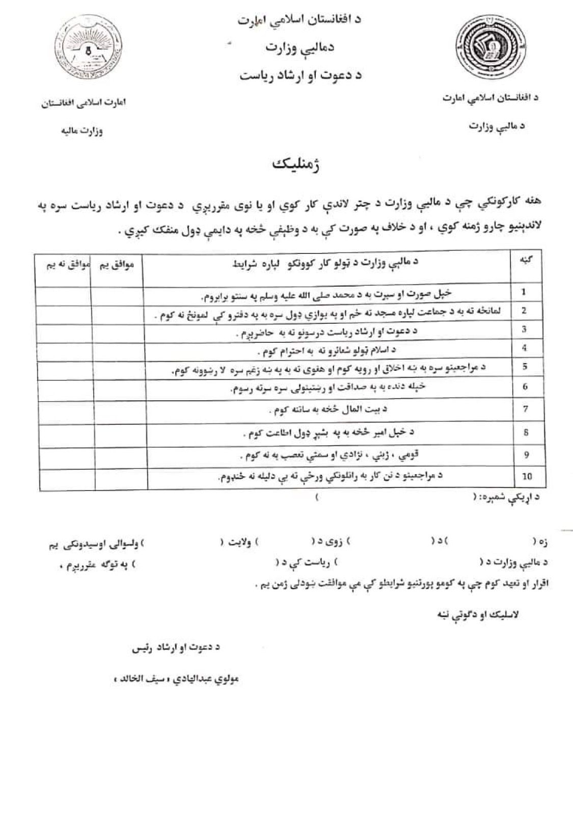 په دې مکتوب کې راغلي چې د مالیې وزارت په مرکز او ولایتونو کې ټول کارکوونکي باید د امر بالمعروف او نهې له منکر وزارت اړوند د دعوت او ارشاد ریاست یوه تعهدنامه لاسلیک کړي.