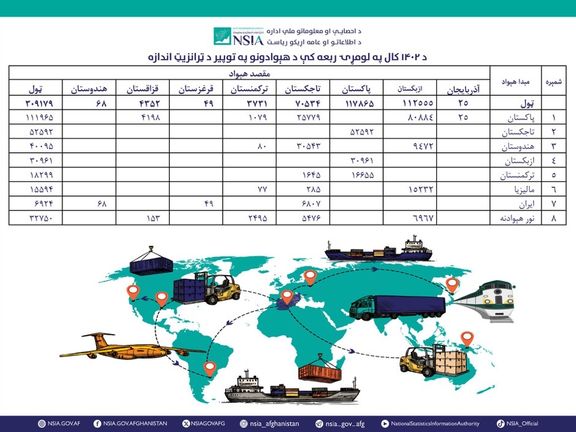 د طالبانو د احصایې او معلوماتو ملي اداره وایي، چې د روان لمریز کال په لومړیو درېیو میاشتو کې د ټرانزیټ ټولیزه اندازه ۳۰۹۱۷۹ ټنو ته رسیږي.