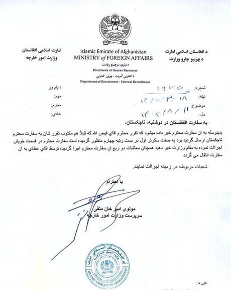 په مکتوب کې په تاجکستان کې د افغانستان سفارت ته لیکل شوي، چې فیض الله د دغه سفارت د اول سکرتر په توګه ګومارل شوی او د دندې د اشغال په برخه کې دې ورسره همکاري وکړي.