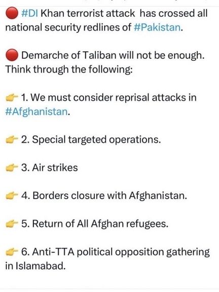 نوموړي په ډېره اسماعیل خان کې د پولیسو پر مرکز برید ته په اشارې پر خپلې اېکس پاڼه لیکلي وو: «د بنو ترهګریز برید د پاکستان د ملي امنیت ټولې سرې کرښې تر پښو لاندې کړې. موږ باید په افغانستان کې د غچ اخیستونکو بریدونو په اړه فکر وکړو.»