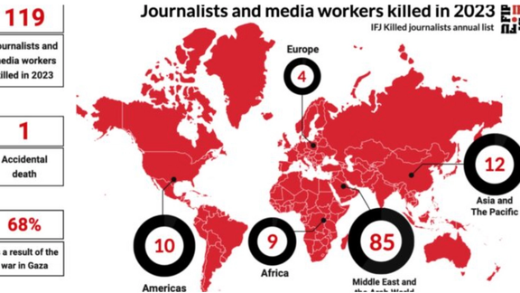 د ژورنالستانو نړۍوال فدراسیون "ای اېف جې" اعلان کړی، چې په ۲۰۲۳ کال کې په ټوله نړۍ کې ۱۲۰ ژورنالستان او د رسنیو کارکوونکي وژل شوي، چې ۱۱ تنه یې میرمنې دي.