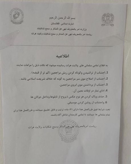 په هرات ولایت کې د طالبانو امر بالمعروف ریاست ټولو سلمانیانو ته امر کړی چې د "لاس قبضې" څخه لږ د ږیرې له کمولو او د "شریعت خلاف" د وېښتو له جوړولو ډډه وکړي. تر دې مخکې هم طالبانو په هرات کې ورته فرمانونه صادر کړي وو.