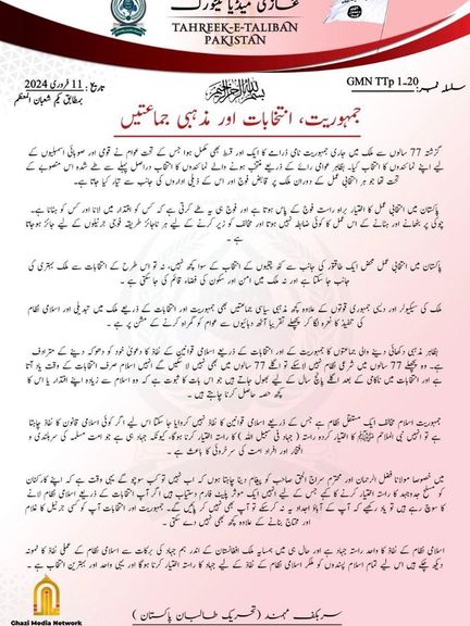د ټي ټي پي وسله والې ډلې د جمعیت علمای اسلام او جماعت اسلامي مشرانو ته د یوې خبرپاڼې له لارې ویلي چې د جمهورت لاره پریږدي او د «جهاد» لاره خپله کړي. دغې ډلې داسې مهال دغو مذهبي ګوندونو ته د «جهاد» بلنه ورکړې چې دواړه ګوندونه د پاکستان په ټاکنو کې ناکام او یا یې لږې څوکۍ ګټلې دي