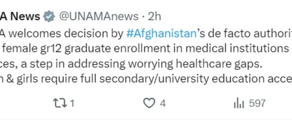 یوناما د پنجشنبې په ورځ په یوولسو ولایتونو کې په طبي موسسو کې د ښځینه زده کوونکو د نوملیکنې په اړه د طالبانو د پرېکړې هرکلی وکړ؛ خو دغه سازمان پر اېکس خواله رسنۍ د دغه پیغام له خپرولو وروسته هغه بیرته لرې کړ.