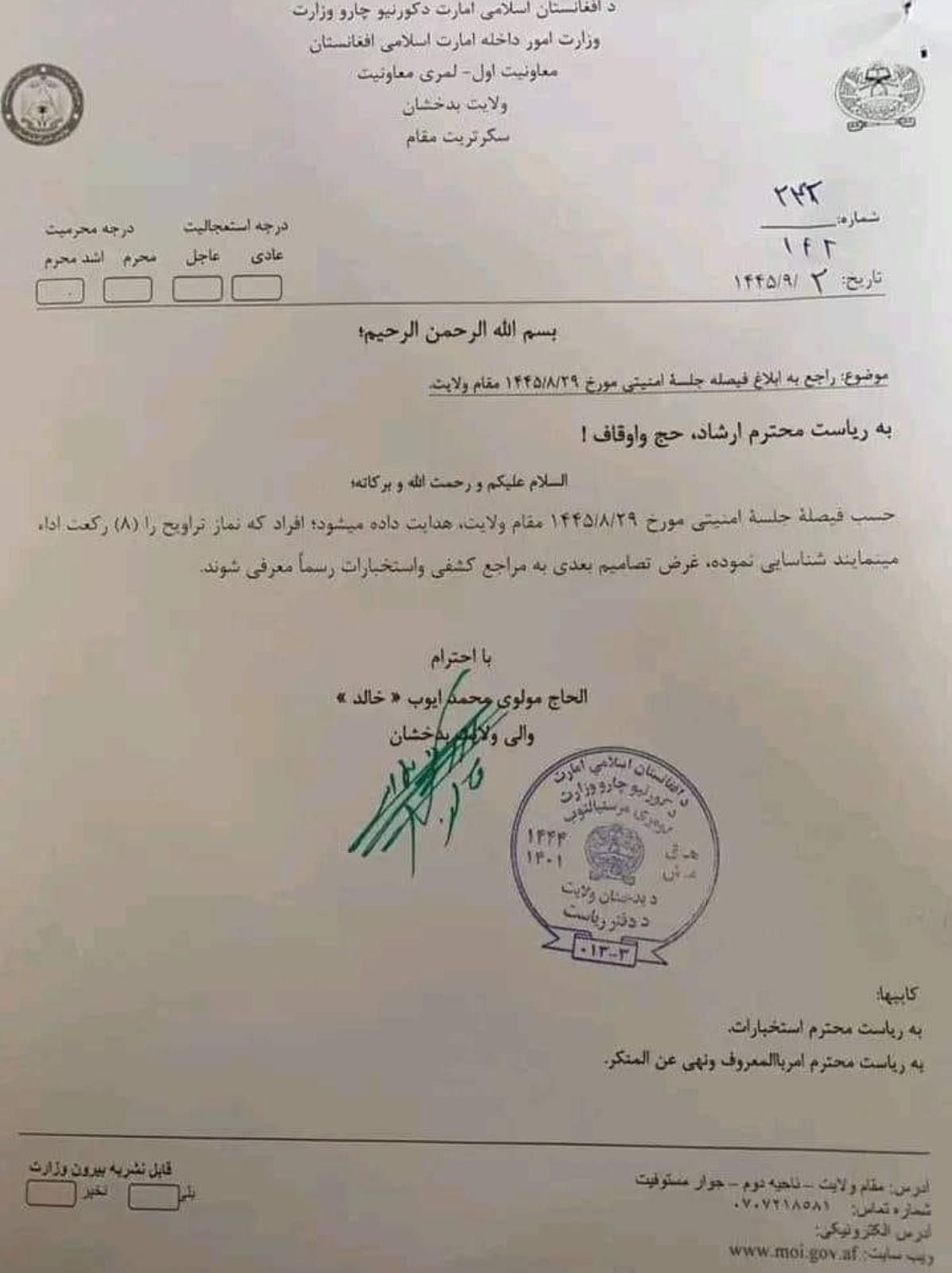 په بدخشان ولایت کې طالبانو ټولو جوماتونو ته مکتوب استولی او لیکلي یې دي، هر هغه چا چې د تراویح لمونځونه له شلو رکعتونو کم ادا کړل ودې نیول شي او قضایي څانګو ته دې ور وپېژندل شي.