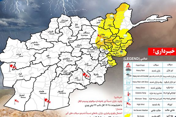 د طالبانو تر واک لاندې د هوا پوهنې ادارې ویلي چې په بدخشان، تخار، کندز، بغلان، پنجشیر، پروان، نورستان، کاپیسا، کابل، کونړ، ننګرهار، لغمان، لوګر، پکتیا او خوست ولایتونو کې به د باران کچه لوړه وي او دغه راز په ځینو سیمو کې به واوره هم ورېږي.
