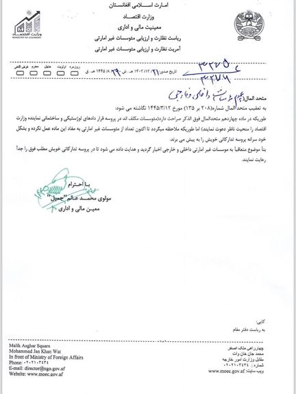 دغه سند د کب په ۲۱مه صادر شوی او د اقتصاد وزارت مالي او اداري مرستیال لاسلیک کړی هم دی.