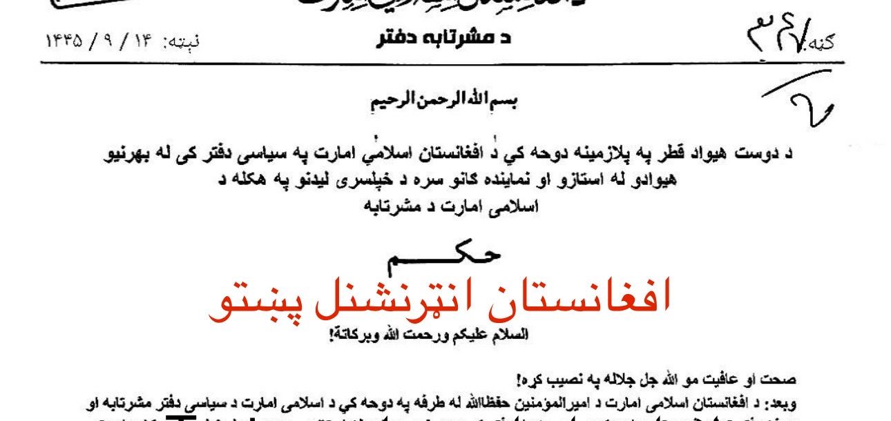 افغانستان انټرنشنل ـ پښتو یو مکتوب ترلاسه کړی، چې پکې د طالبانو مشر ملا هبت الله اخوندزاده په دغه ډله کې د درز پیدا کېدو د مخنیوي لپاره دوحه کې له سیاسي دفتر او نورو طالب چارواکو غوښتي، چې په دغه دفتر کې د بهرنیو هېوادونو له استازو سره هر ډول «خپلسرې ښکاره او پټي غونډې منع دي.»