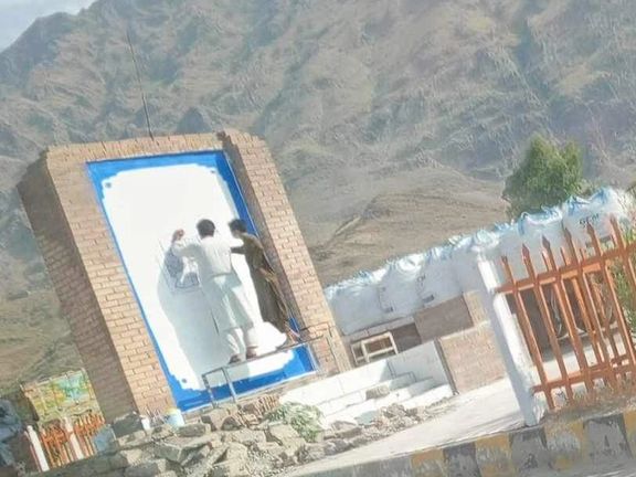 د هغو انځورونو له مخې چې افغانستان انټرنشنل ته رسیدلي، دوه کسان په تورخم ښارګوټي کې د شاه امان الله خان د لرې شوي انځور پر ځای د طالبانو سپین بیرغ لګوي.