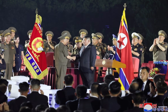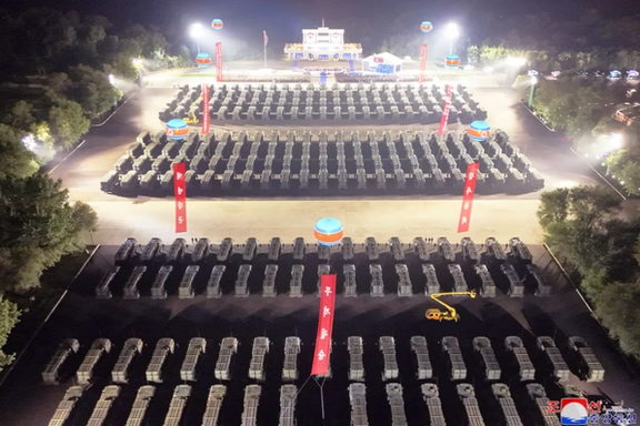 د شمالي کوریا د دولتي رسنۍ له خوا خپاره شوي عکسونو کې د سرو بینرونو سربیره د توغندیو قطارونه ښودل شويږ د توغندیو د سپارلو دغه مراسم د شپې له خوا د کیم په ګدون ترسره شوې.