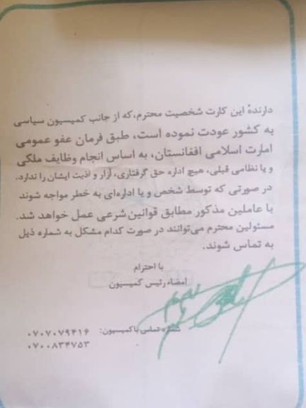 د کارت په بو برخه کې لیکل شوي دي « ددې کارت لرونکی شخصیت د طالبانو سیاسي کمېسون لخوا هېواد ته راستون شوی دی، د اسلامي امارت د عمومي عفوې له مخې دغه کس د پخواني ملکي او نظامي دندو له مله هېڅ اداره ددې کس د نیولو حق نه لري»