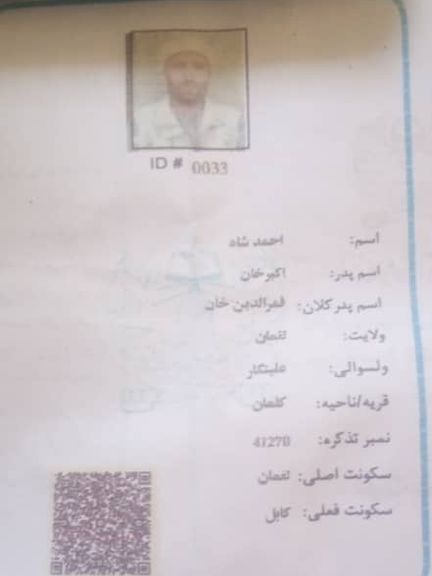 د احمد شاه کورنۍ له افغانستان انټرنشنل ـ پښتو سره د طالبانو د کمېسون لخوا ورکړل شوی کارت کاپي هم شریکه کړه.