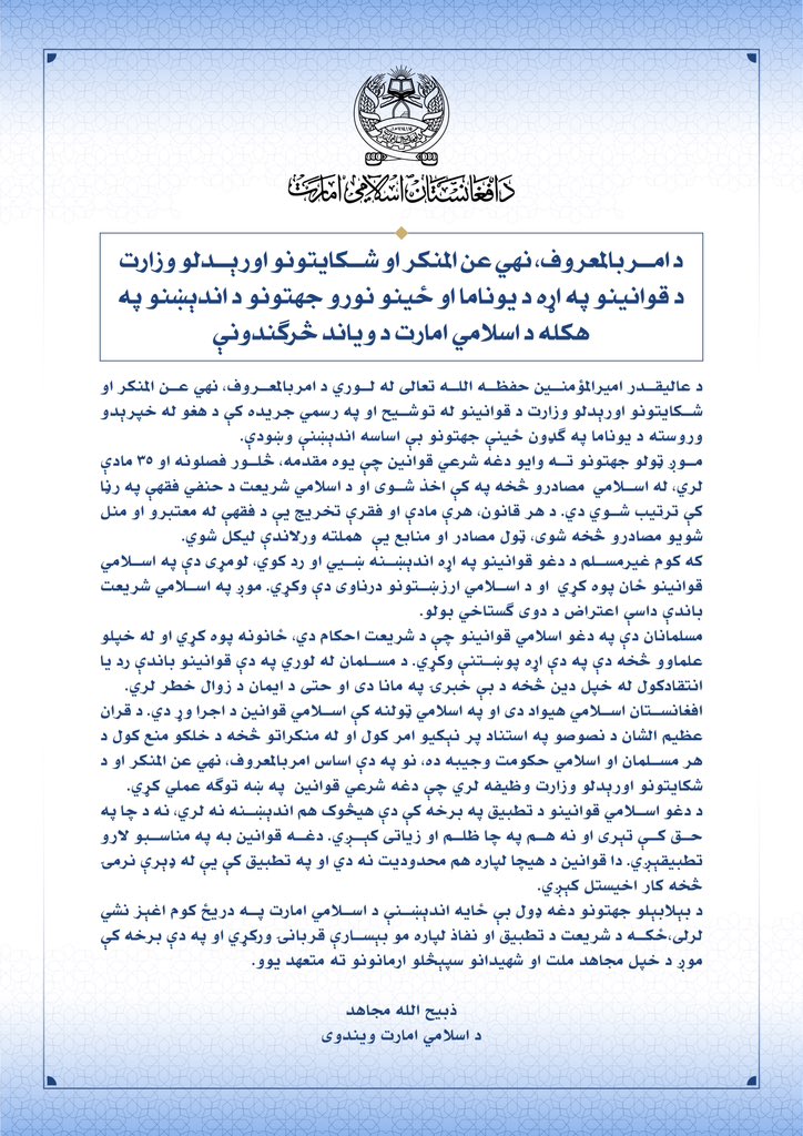 د مجاهد له قوله په یوې خپره شوې خبرپاڼه کې راغلي: «موږ ټولو جهتونو ته وایو دغه شرعي قوانین له اسلامي مصادرو څخه اخذ شوي او د اسلامي شريعت د حنفي فقهې په رڼا کې ترتيب شوي دي. د هر قانون، هرې مادې او فقرې تخريج يې د فقهې له معتبرو او منل شويو مصادرو څخه شوی، ټول مصادر او منابع يې هملته ور لاندې ليکل شوي.» د یادې ډلې په خبرپاڼه کې د امربالمعروف او نهې عن المنکر قانون پر وړاندې د یوناما په ګډون د ځینو جهتونو اعتراض ګستاخي بلل شوې ده. ذبیح الله مجاهد زیاته کړې ده، چې که دا قانون د مسلمانانو له خوا ردیږي او نیوکه پرې کیږي؛ نو له دین څخه د دوی د بې خبرۍ په معنا ده او ایمان یې له زوال سره مخ دی. نوموړي په ټولو مسلمانانو غږ کړئ: «په دغو اسلامي قوانینو چې د شریعت احکام دي، ځانونه پوه کړئ او له خپلو علماو څخه په دې اړه پوښتنې وکړئ.» د طالبانو ویاند ویلي، چې افغانستان یو اسلامي هېواد دی او په اسلامي ټولنه کې اسلامي قوانین د اجرا وړ دي. ښاغلی مجاهد وایي، چې د دغو اسلامي قوانینو د پلي کولو په برخه کې دې هېڅوک اندېښنه نه لري؛ ځکه قوانین د هېچا لپاره هم محدودیت نه دي، نه د چا په حق کې تېری او نه هم په چا ظلم او زیاتی دی. د خبرپاڼې په یوې بله برخه کې راغلي، چې د امربالمعروف او نهې عن المنکر نوي قوانین به په مناسبو لارو پلي شي او د ټولو پر وړاندې به له نرمۍ څخه کار واخیستل شي. د طالبانو ویاند ذبیح الله مجاهد وایي: «د بېلابېلو جهتونو دغه ډول بې ځایه اندېښنې د اسلامي امارت په دریځ کوم اغېز نشي لرلی، ځکه د شريعت د تطبيق او نفاذ لپاره مو بې سارې قربانۍ ورکړي او په دې برخه کې موږ د خپل مجاهد ملت او شهیدانو سپېڅلو ارمانونو ته متعهد یو.»