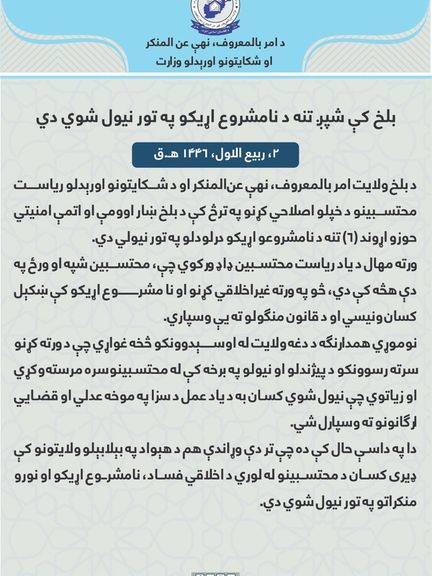 د طالبانو د امربالمعروف وزارت په بلخ ولایت کې د «نامشروع» اړیکو په تور د شپږو کسانو د نیولو خبر ورکړی. دغه وزارت د پنجشنبې په ورځ د یوې خبرپاڼې په خپرولو سره ویلي، چې یاد شمېر کسان د مزار شریف ښار د اوومې او اتمې امنیتي حوزو له شاوخوا سیمو څخه نیول شوي دي.