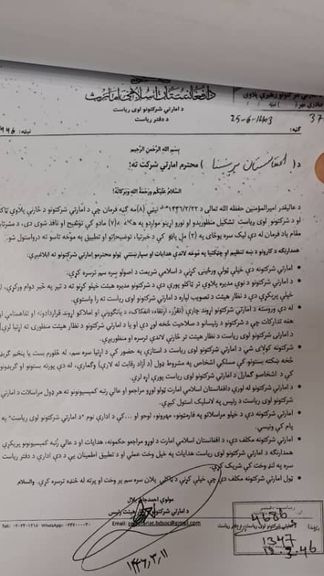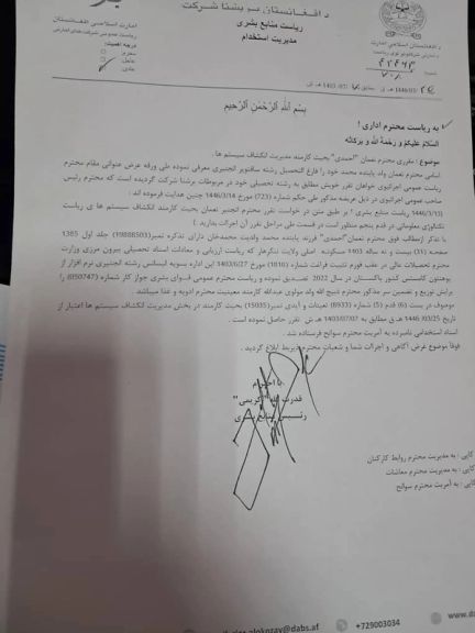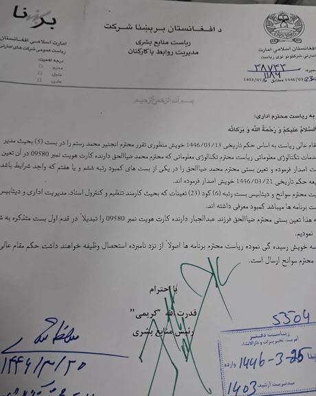 په یو بل مکتوب چې افغانستان انټرنشنل ترلاسه کړی، د طالبانو د برېښنا د عمومي رییس عبدالباري عمر په امر ،د دې شرکت د بشري منابعو د رییس په لاسلیک د ضیاالحق په نوم یو ملا چې له مدرسې فارغ دی او هېڅ تعلیمي اسناد نه لري، د پخواني حکومت د یو کارمند پر ځای ګومارل شوی، چې هغه مسلکي انجنیر و.