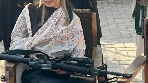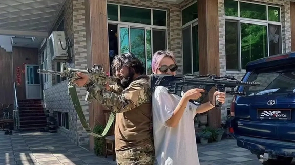 په یو بل انځور کې بیا یوه چینايي ښځه او یو طالب سرتیری لیدل کیږي چې د امریکايي وسلو سره د نښه ویشتلو انداز کوي.