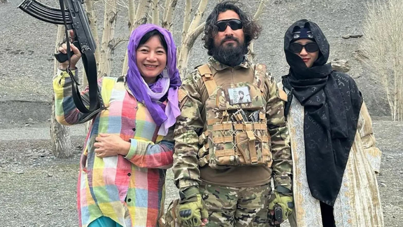 په یو بل انځور کې یو طالب سرتیری له دوو چینایي ښځو سره چې اسلامي حجاب یې اغوستی لیدل کیږي چې په ظاهره له ښاره بهر په یوه باغ کې دي.