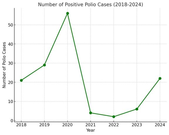 د روان ۲۰۲۴ کال په سپټمبر میاشت روغتیا نړۍوال سازمان یو راپور خپور کړ چې په کې له ۲۰۱۸ کال را نیولې د ۲۰۲۴ کال تر سپټمبر میاشتې پورې د پولیو تایید شوې مثبتې پېښې ښيي، دغه راپور زیاتوي چې په افغانستان کې تر ټولو کمې د پولیو ناروغۍ مثبتې پېښې په ۲۰۲۲ کې (دوه) او تر ټولو ډېرې پېښې په ۲۰۲۰ کې (۵۶) یادې شوې دي.
