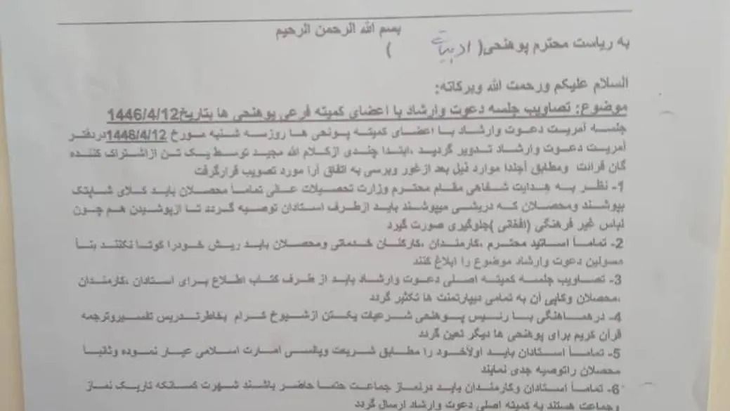 د امربالمعروف د امریت په رسمي لیک زیاته شوې، چې استادان باید د طالبانو مذهبي امرونه په پام کې ونیسي او له محصلینو هم وغواړي، چې له دې دستور څخه پیروي وکړي.