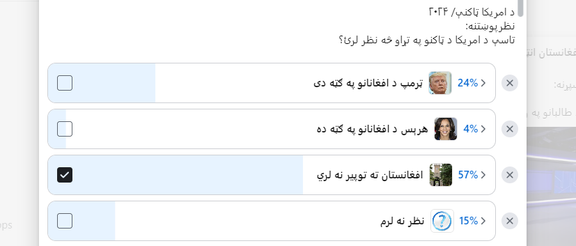 د دغې نظرپوښتنې ۲۴ سلنه ګډونوال ټرمپ او ۴ سلنه ګډونوال هرېس د افغانستان او افغانانو په ګټه بولي.