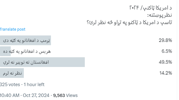 پر اېکس ټولنیزه شبکه په دغې نظرپوښتنه کې ۳۲۵ کسانو برخه اخیستې ده، چې ۲۹.۹ سلنه ګډونوال باور لري چې که ټرمپ ولسمشر شي د افغانانو په ګټه دی.