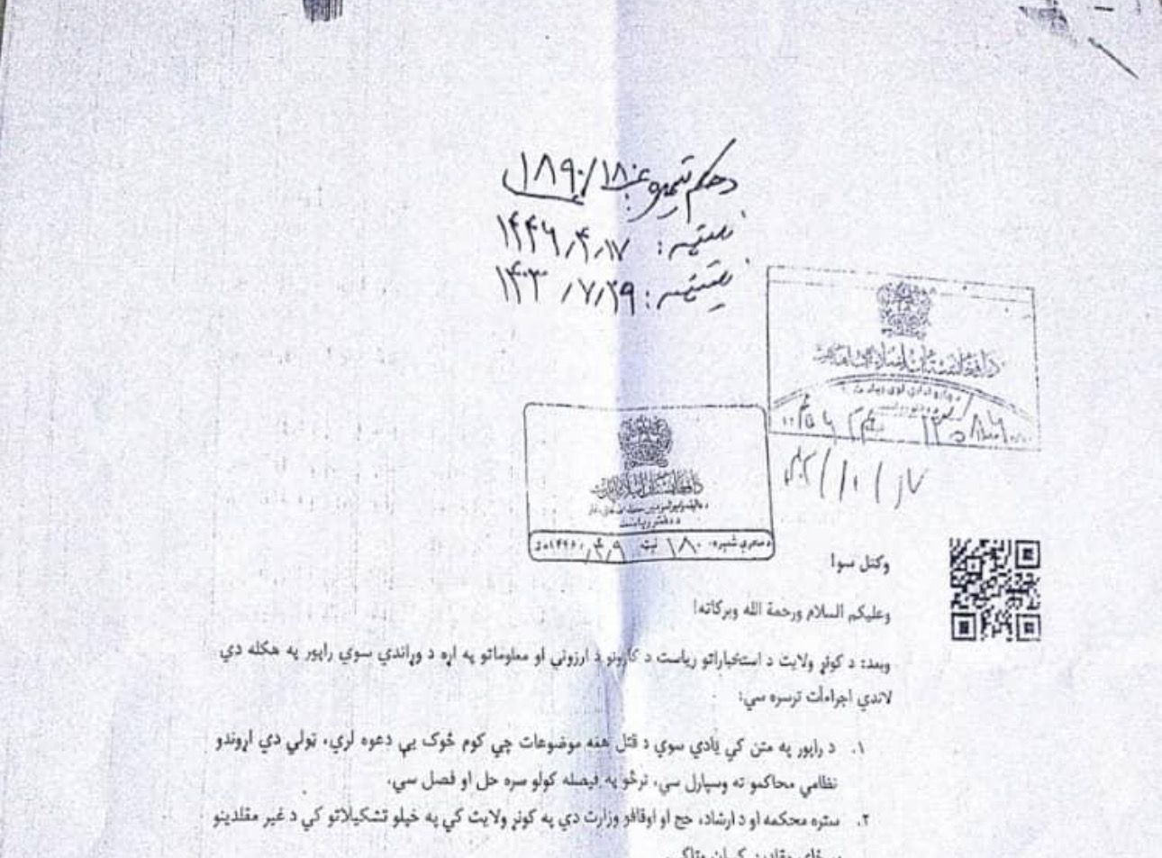 د طالبانو د مشر ملاهبت الله له دفتره شاوخوا شل ورځې وړاندې په کابل کې د طالبانو د استبخاراتو عمومي ریاست ته یو حکم لېږل شوی چې د غیر مقلدینو د نفوذ پر مخنیوي متمرکز دی.
