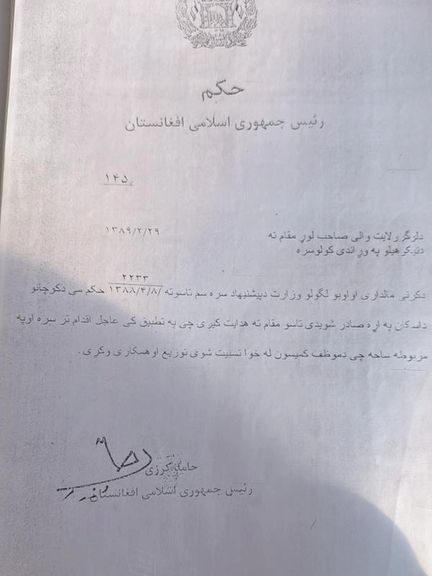 په لوګر ولایت کې د کوچیانو ځینو مشرانو نن یکشنبه «د مرغومي ۳مه» د پخواني ولسمشر حامد کرزي له خوا یولړ پخواني صادر شوي حکمونه او د ځمکو اړوند اسناد له افغانستان انټرنشنل سره شریک کړل.