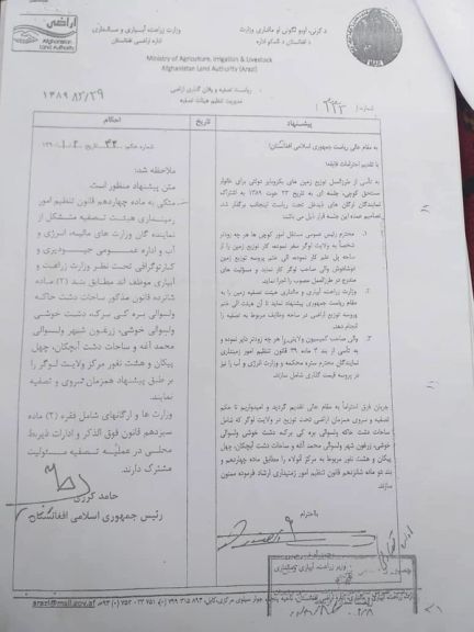 په یوه بل مکتوب کې د پخواني ولسمشر حامد کرزي د حکم پر بنست، د اراضي ادارې د لوګر د خوشي ولسوالۍ په دشت خوشي کې پر کوچیانو ځمکه وېشلې ده.