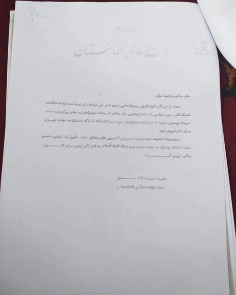 ددغه حکم یوه کاپي هم له افغانستان انټرنشنل سره شریکه شوې چې د هغه وخت د اسلامي دولت مشر صبغت الله مجددي پکې لیکلي، چې له کډوالۍ راستنو شویو کوچیانو ته دې په لوکر کې د اوسېدو لپاره ځمکې په واک کې ورکړل شي.