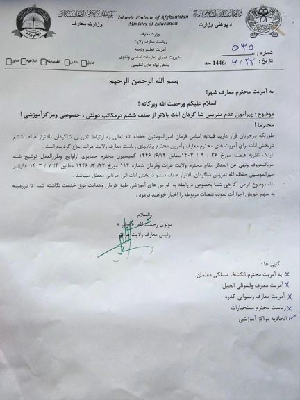 په هرات کې د طالبانو د پوهنې رییس رحمت الله جابر نن په یوه مکتوب کې ویلي، د دغه ولایت په کورسونو کې تر شپږم ټولګي د پورته نجونو زدکړې منع دي. دغه طالب چارواکي ویلي، د دې ډلې د مشر د حکم له مخې، کورسونو کې تر شپږم ټولګي پورته نجونې زدکړې نشي کولی.