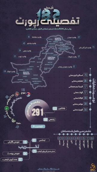 د پاکستاني طالبانو تحریک نن چارشنبه (د جنوري لومړۍ) په یوه اعلامیه کې ویلي چې پر پاکستاني امنیتي ځواکونو د خپلو بریدونو په ترڅ کې یې د تېر ۲۰۲۴ کال په جنوري کې ۷۵، فېبروري کې ۶۵، مارچ کې ۶۶، اپریل کې ۹۶، می کې ۹۹، جون کې ۹۶، جولای کې ۱۴۶، اګسټ کې ۲۴۳، سپتمبر کې ۲۶۲، اکټوبر کې ۲۲۰، نومبر کې ۲۰۸ او ډسمبر کې ۱۸۲ بریدونه کړي دي.