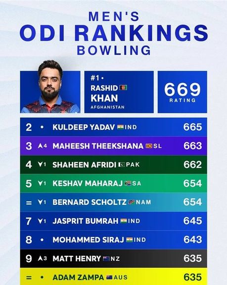 د کرېکت نړۍوالې شورا د یو ورځنیو لوبو د توپ اچوونکو په ډلبندۍ کې راشدخان لاهم په کې لومړی ځای لري.