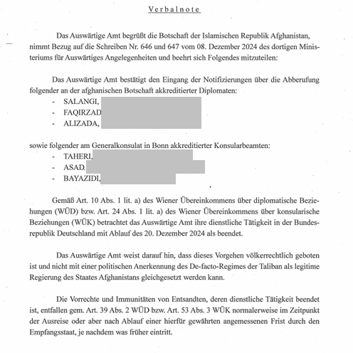 د جرمني بهرنیو چارو وزارت د یوه مکتوب له لارې په برلین کې افغان سفارت ته ویلي، چې د ډیپلوماتیکو اړیکو د وین کنوانسیون د ۱۰مې مادې د لومړۍ فقرې او کونسلګرۍ اړیکو د وین کنوانسیون د ۲۴ مې مادې د لومړۍ فقرې له مخې، په جرمني کې د یادو کسانو د رسمي دندو پای د ۲۰۲۴ کال د ډسمبر ۲۰مه ده.