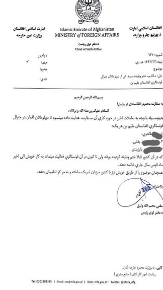 طالبانو په برلین سفارت او بن کونسلګرۍ کې د شپږو ډيپلوماټانو د لرې کولو لپاره دوه جلا مکتوبونه استولي دي.