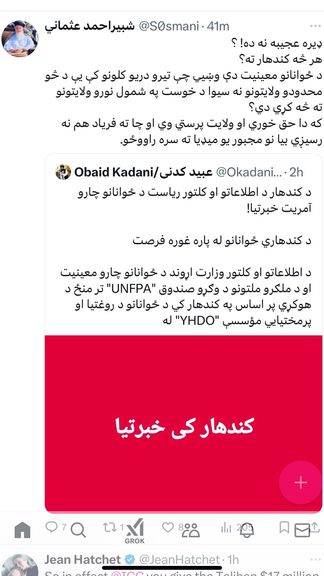 پر کور د کښینول شوي دغه طالب چارواکي د څرګندونو په غبرګون له کندهار د اېکس یوه فعال کس لیکلي:«ورسه د خپل اړوند ولایت له مسولیینو غوښتنه وکړه، کار ټول ستا په ولایت کې خراب دی.»
