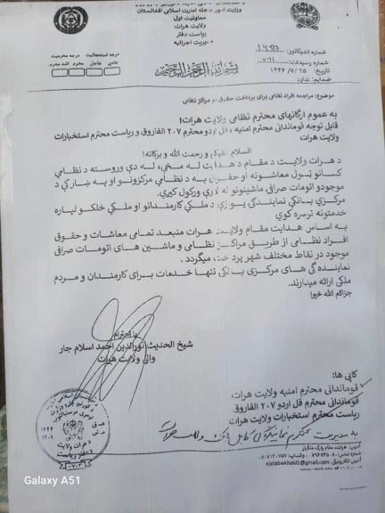 په هرات کې طالبانو ددغه ولایت د امنیه قوماندانۍ، د استخباراتو ریاست او د ۲۰۷ الفاروق قول اردو له کارکوونکو غوښتي، چې د دوی معاشونه به په خپلو نظامي مراکزو کې ورکول کېږي. افغانستان انټرنشنل ته رسېدلي مکتوب کې لیکل شوي چې مرکزي بانکي نمایندګۍ یوازې د ملکي مامورانو معاشونه ورکوي.
