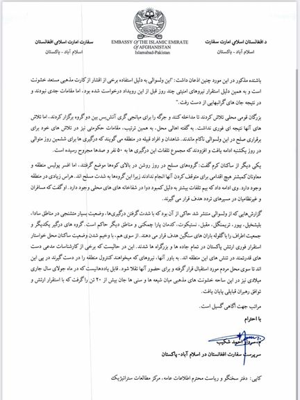 د طالبانو سفارت د سیمې د خلکو په حواله لیکلي چې دواړه لورو په رڼا ورځ مورچو کې ځای پر ځای شول؛ خو هغه وخت نه پاکستاني پولیسو او نه هم کمیشنر د ځايي وسلوالو مخه ونیوله.