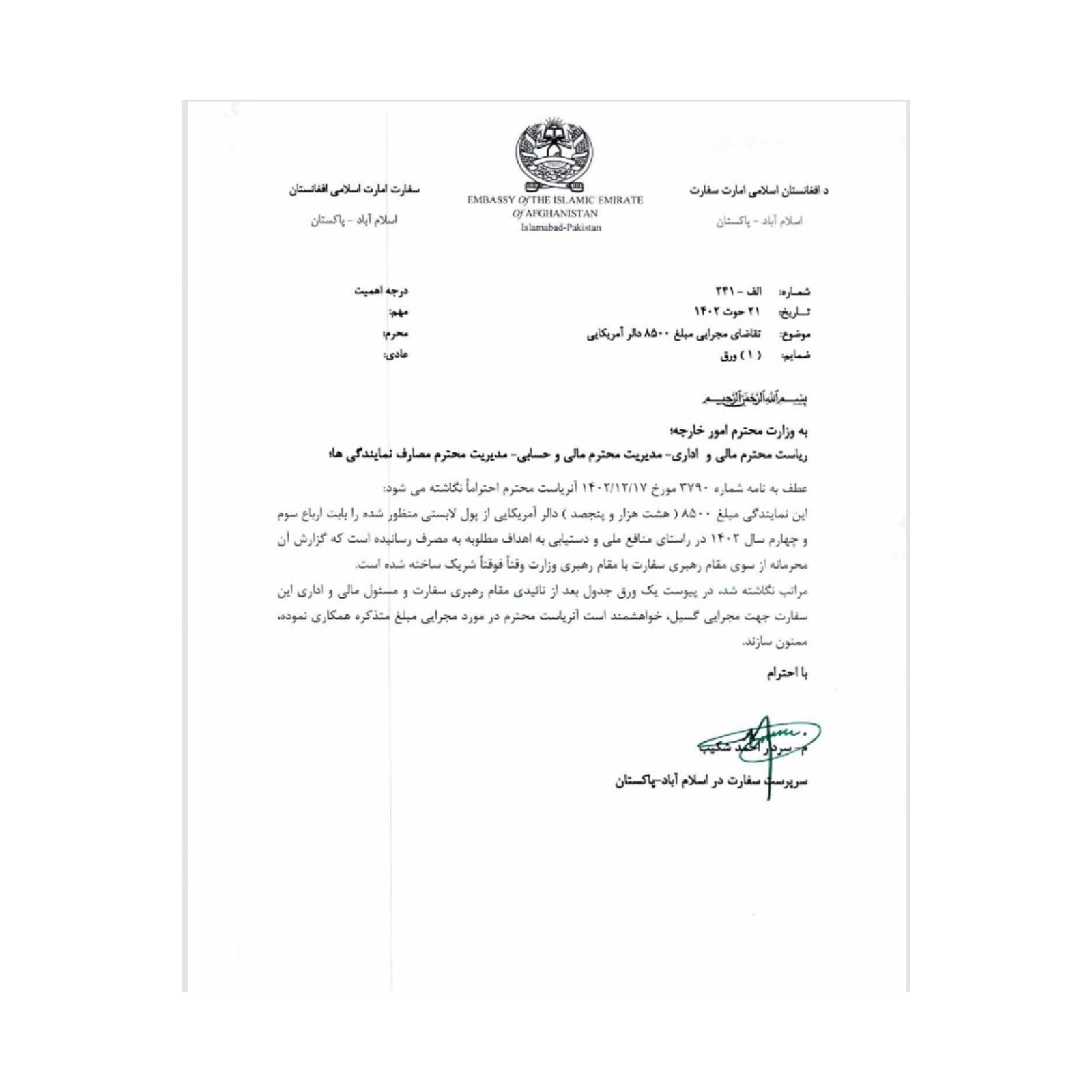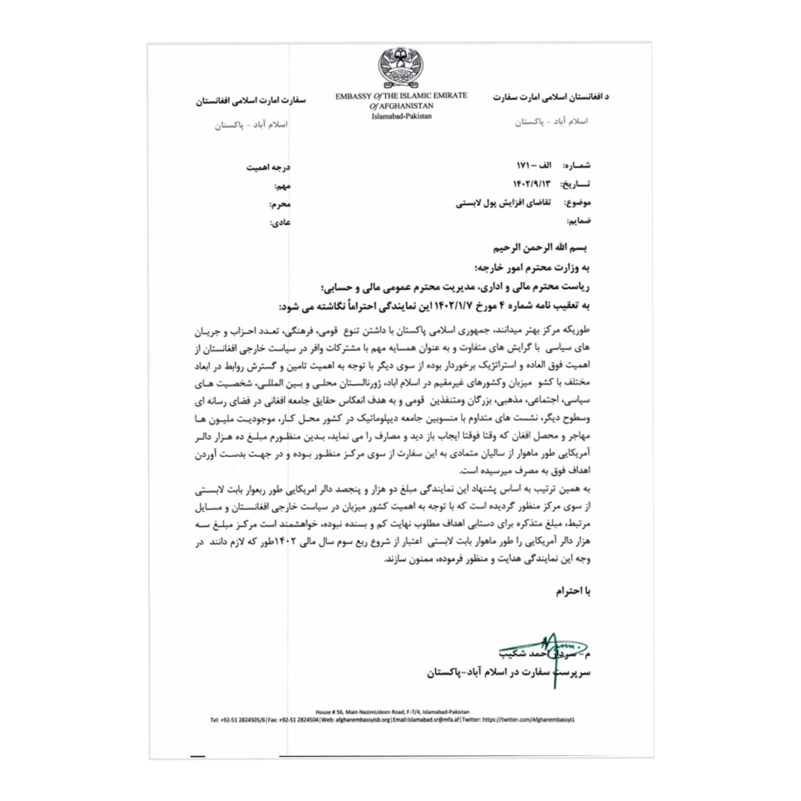 په دغه مکتوب کې راغلي، چې د طالبانو سفیر سردار احمد شکېب د خپلو سفارتي فعالیتونو د لا پراختیا او خپلې ډلې ته د لابي ګرۍ لپاره د نورې بودجې ترلاسه کولو هڅه کوي.