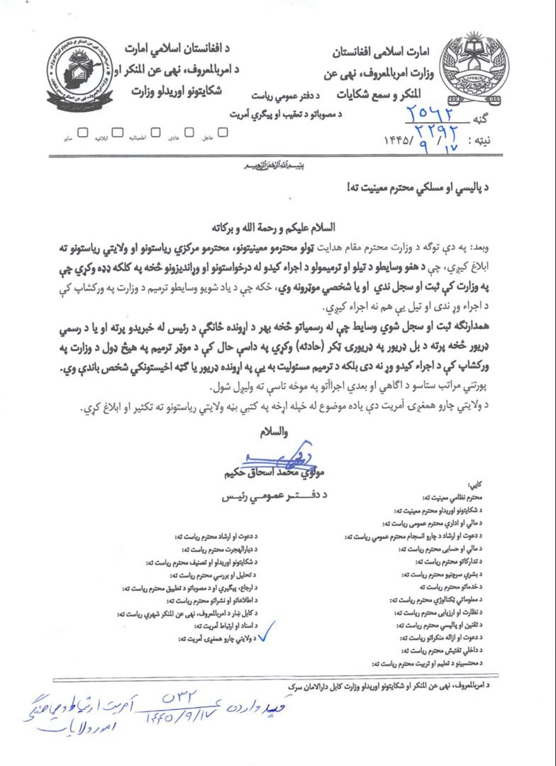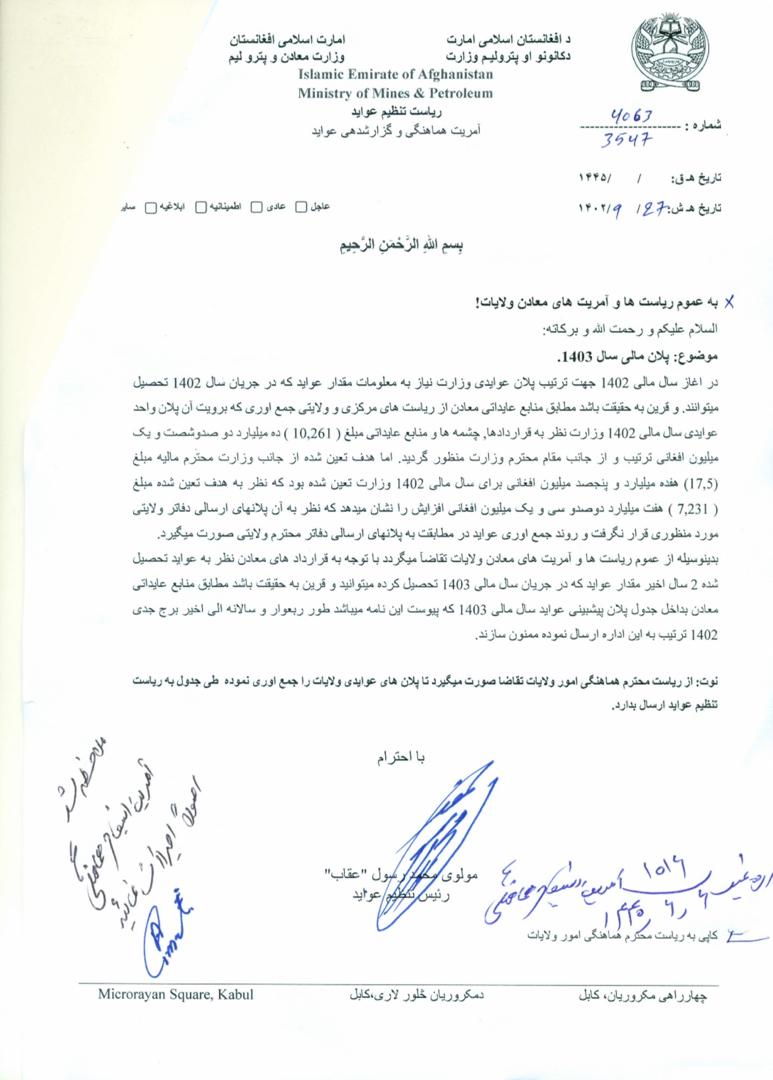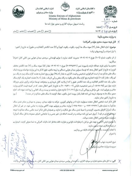 په دغه مکتوب کې د طالبانو د کانونو وزارت د دې ډلې له مالیې وزارت څخه غوښتي، چې یاد کس ته دې یوه بهرني هېواد ته د یاقوت، زمرد او عقیق د لېږد اجازه ورکړي.