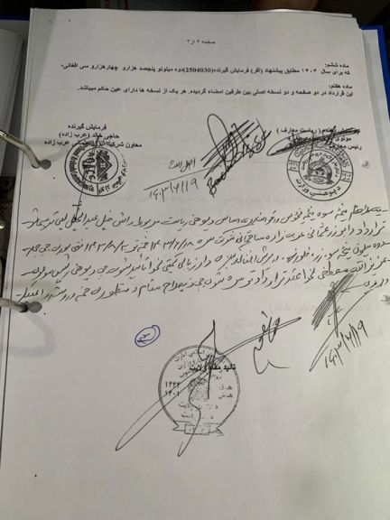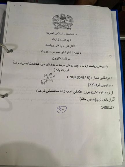 د دواړو خواوو د قراداد پر بنسټ، د ننګرهار د طالبانو د پوهنې ریاست او د «ابوزر عثماني عربزاده د ساختماني چارو شرکت» ترمنځ د دوه مېلیونه او ۵۰۰ زرو، ۴ زره او ۳۰ (۲۵۰۴۰۳۰) افغانیو قرارداد لاسلیک شوی دی.