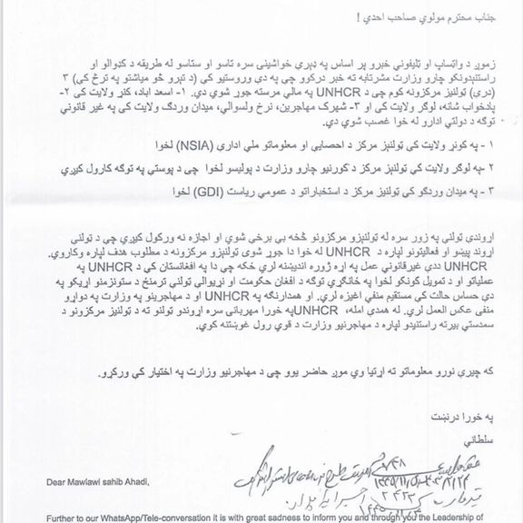 د ملګرو ملتونو د کډوالۍ عالي کمېشنرۍ یا یونیسیار د طالبانو کډوالو چارو وزارت ته په یو مکتوب کې اندېښنه شریکه، چې په میدان وردګ کې طالب استخباراتو، په لوګر کې پوليسو او په کونړ کې د احصايي او معلوماتو ادارې د دوی مرګزونه په زور نیولي.