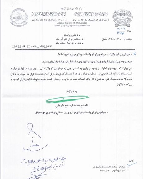 د کډوالو چارو وزارت د مالي او ادارې مرستيال محمد ارسلاح خروټي په امضاء هم په یوه مکتوب کې یاده ستونزه منلې او خپلو اړونده ریاستونو ته یې سپارښتنې کړي، چې د طالبانو له اړوند ادارو دا ځایونه بېرته واخلي او موضوع تعقیب کړي.