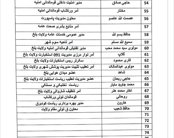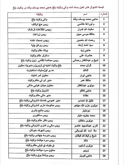 افغانستان انټرنشنل - پښتو ته رسېدلي سندونه ښيي، چې په بلخ ولایت کې د طالبانو والي یوسف وفا خپل نږدې ۷۰ ملګري او خپلوان په لوړو دولتي بستونو کې ګومارلي دي.