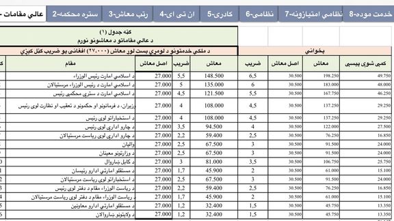 دا لېست ښيي چې طالبانو د ملکي خدمتونو د لومړۍ درجې د کارکوونکو معاش ۲۷ زره افغانۍ ټاکلی چې له ۱.۵ څخه تر ۶.۵ باندې ضرب کړي دي.
