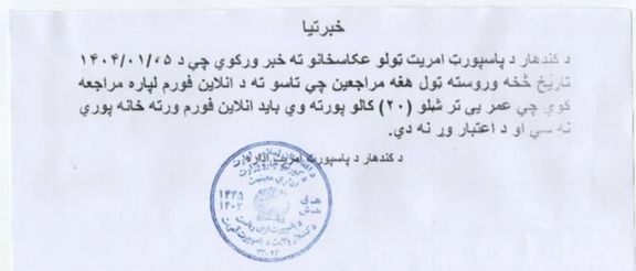 په کندهار کې د طالبانو پاسپورټ ادارې د کابل د امر خلاف له خلکو غوښتي، چې د پاسپورټ لپاره په لیکلې بڼه د فورمو له لارې نوملیکنې وکړي.