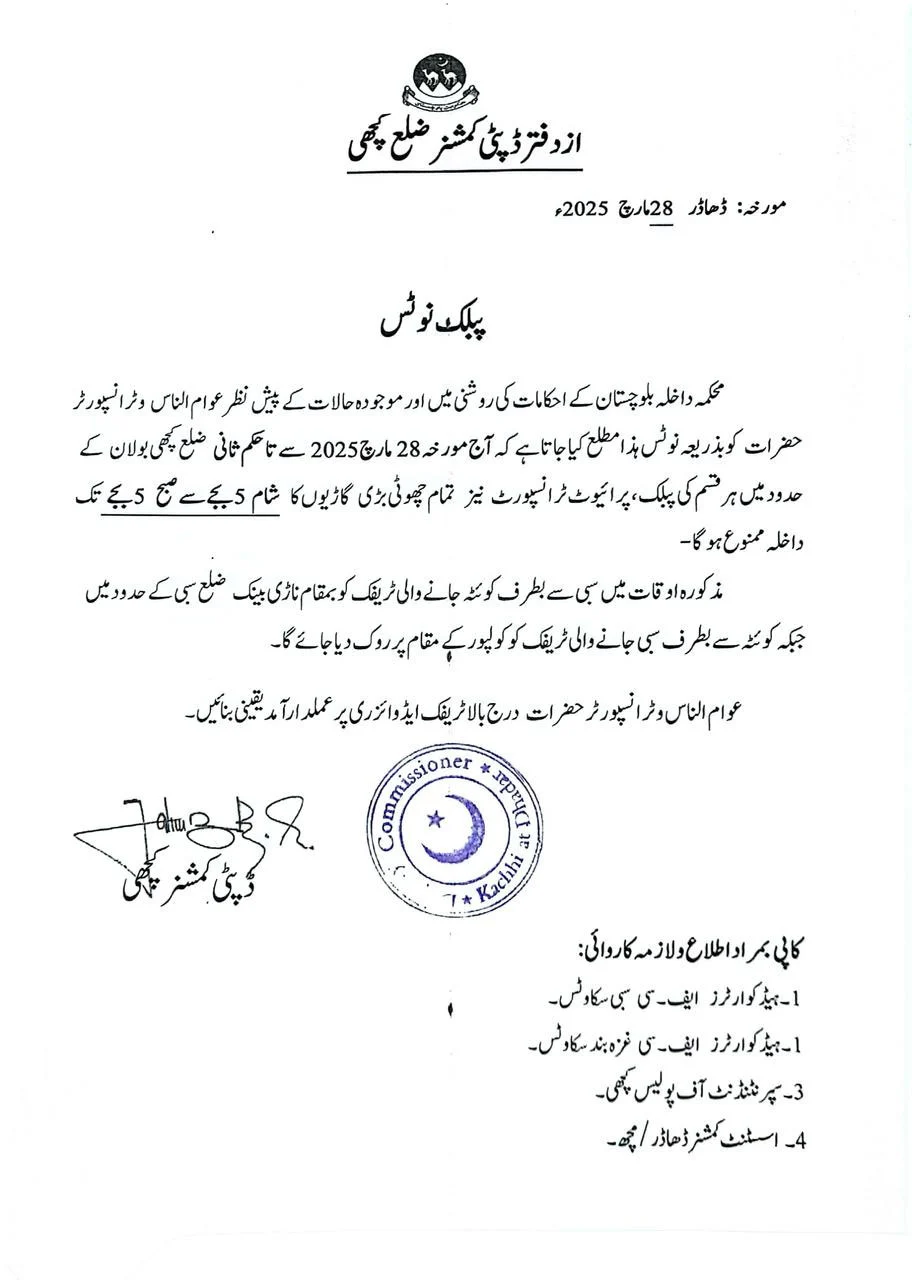 د بلوڅو ازادۍ غوښتونکو له بریدونو وروسته پاکستان د بلوچستان او په ځانګړې توګه بولان کې پر لویو لارو تګ محدود کړ. د بلوچستان داخله چارو ادارې د یوې خبرتیا په خپرولو سره ویلي چې هېڅوک نشي کولی د بلوچستان لویو لارو باندې د ماښام له ۶ بجو تر سهار ۶ بجو سفر وکړي.