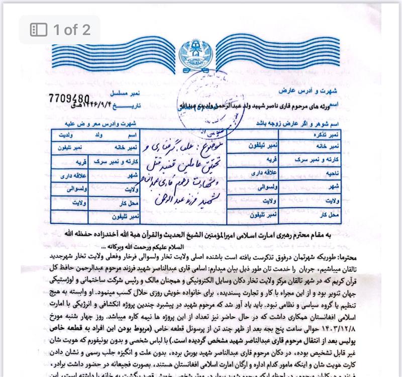 ملاهبت الله ته لیکل شوې عریضه کې ویل شوي، چې له پیښې وروسته په تخار کې د طالبانو ځايي ادارو ته ورغلي څو د عبدالناصر د وژل کېدو د علت په اړه پوه شي خو تر اوسه د طالبانو د تخار والي او ددغه ولایت امنیه قوماندانۍ ترڅنګ هېڅ کومې ادارې ورته قناعت وړ ځواب نه دی ویلی.