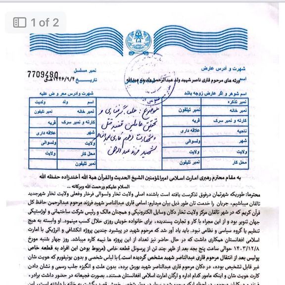 افغانستان انټرنشنل ته د رارسېدلو سندونو له مخې، په تخار کې د یوه ځايي سوداګر کورنۍ وايي چې عبدالناصر شاوخوا یوه میاشت وړاندې د طالبانو د پولیسو ځانګړې قطعې ونیوه او درې ورځې وروسته یې د نوموړي جسد ور وسپاره. دې کورنۍ ملاهبت الله ته عریضه کړې او د عدالت غوښتنه کوي.