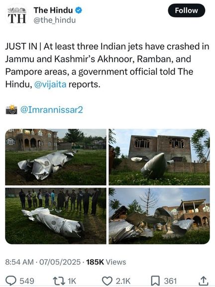 د هندوستان هندو ورځپاڼې د یوه هندي چارواکي په حواله خبر ورکړی، چې د هند درې جنګي جیټ الوتکې پر پاکستان له بریدونو وروسته په جمو او کشمیر کې غورځېدلی دي. په خبر کې دا نه دي ویل شوي، چې الوتکې په توغندیو غورځېدلې او که کومې تخنیکي ستونزې لرلې.